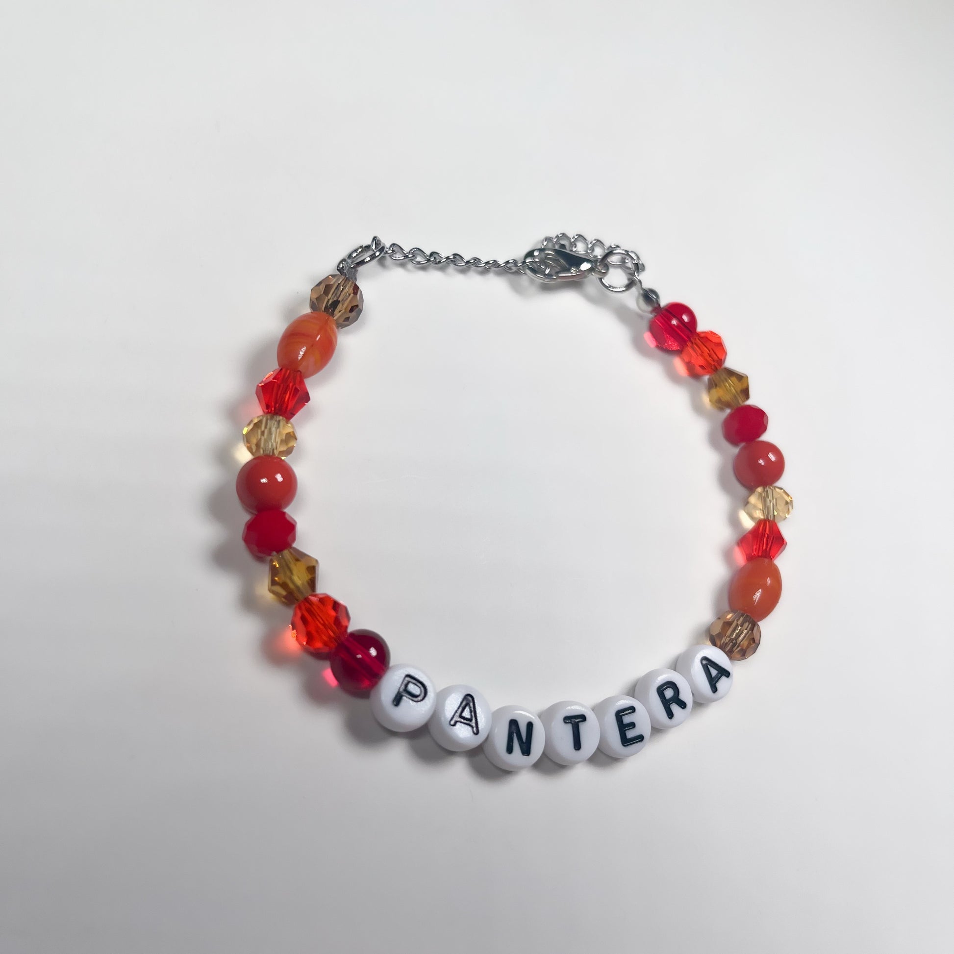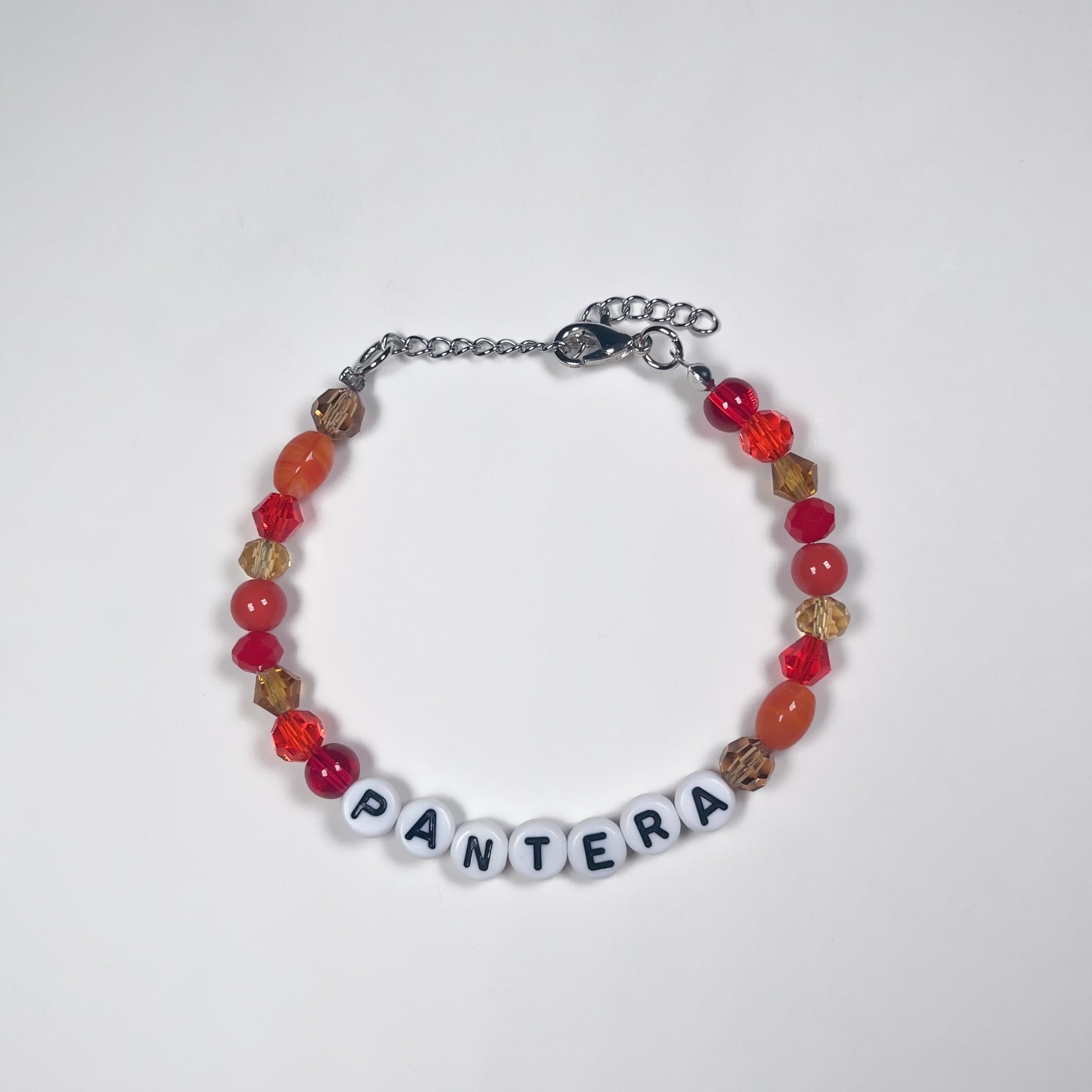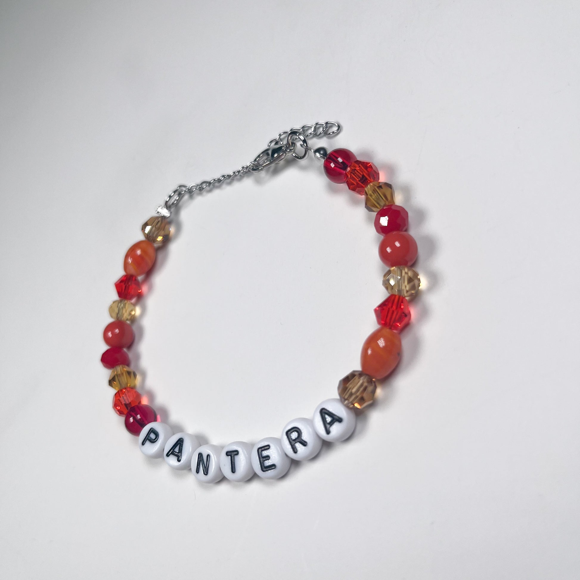 Made with: glass beads, and plastic letter beads on a stainless steel wire with a 4cm stainless steel adjustable chain.