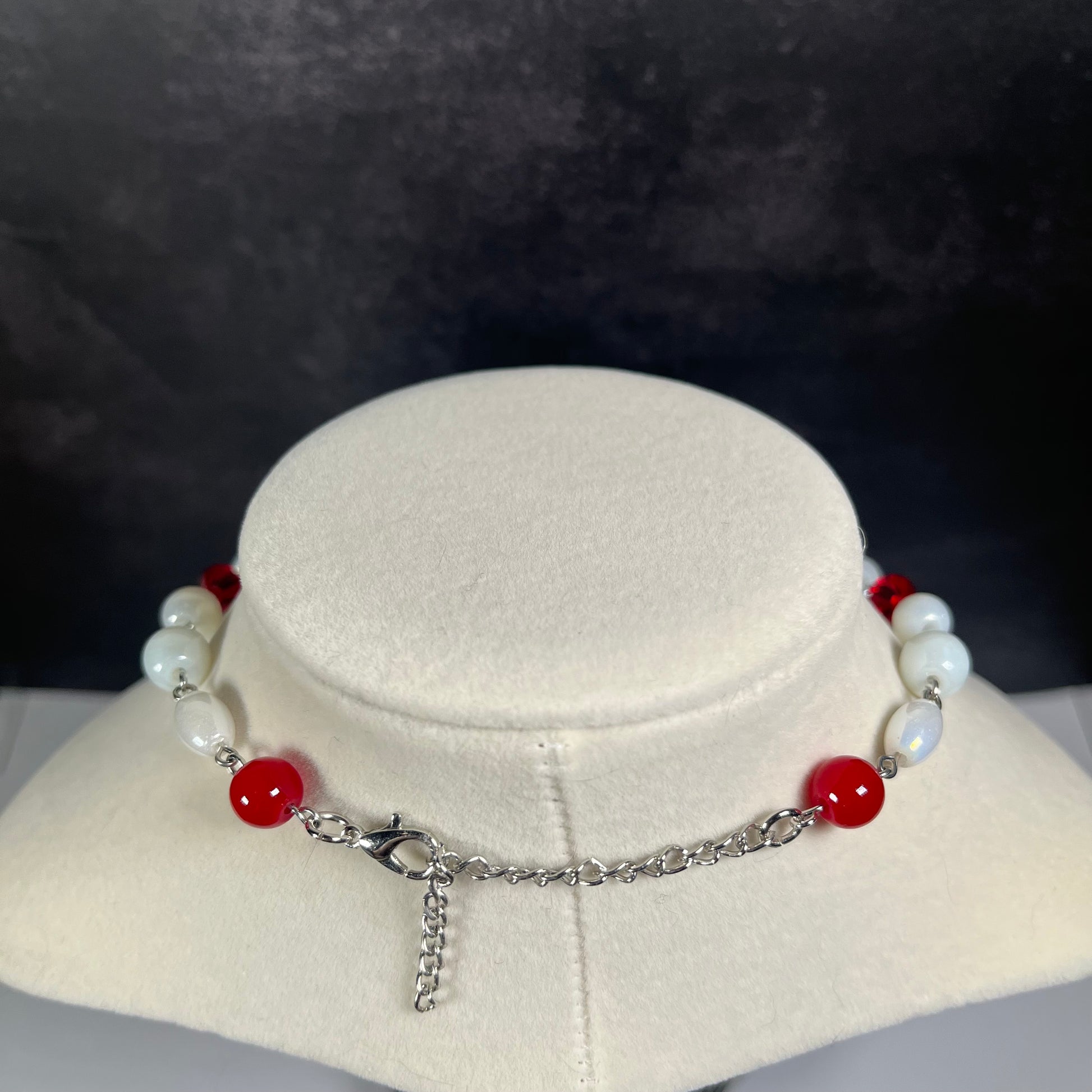 The choker layer showcases a delicate fleur-de-lis pendant, symbolizing purity and light, while the lower strand highlights a striking sacred heart pendant — the glowing centerpiece of this ethereal design. Subtle dangling teardrop glass beads add a touch of celestial shimmer, completing the look with heavenly charm.